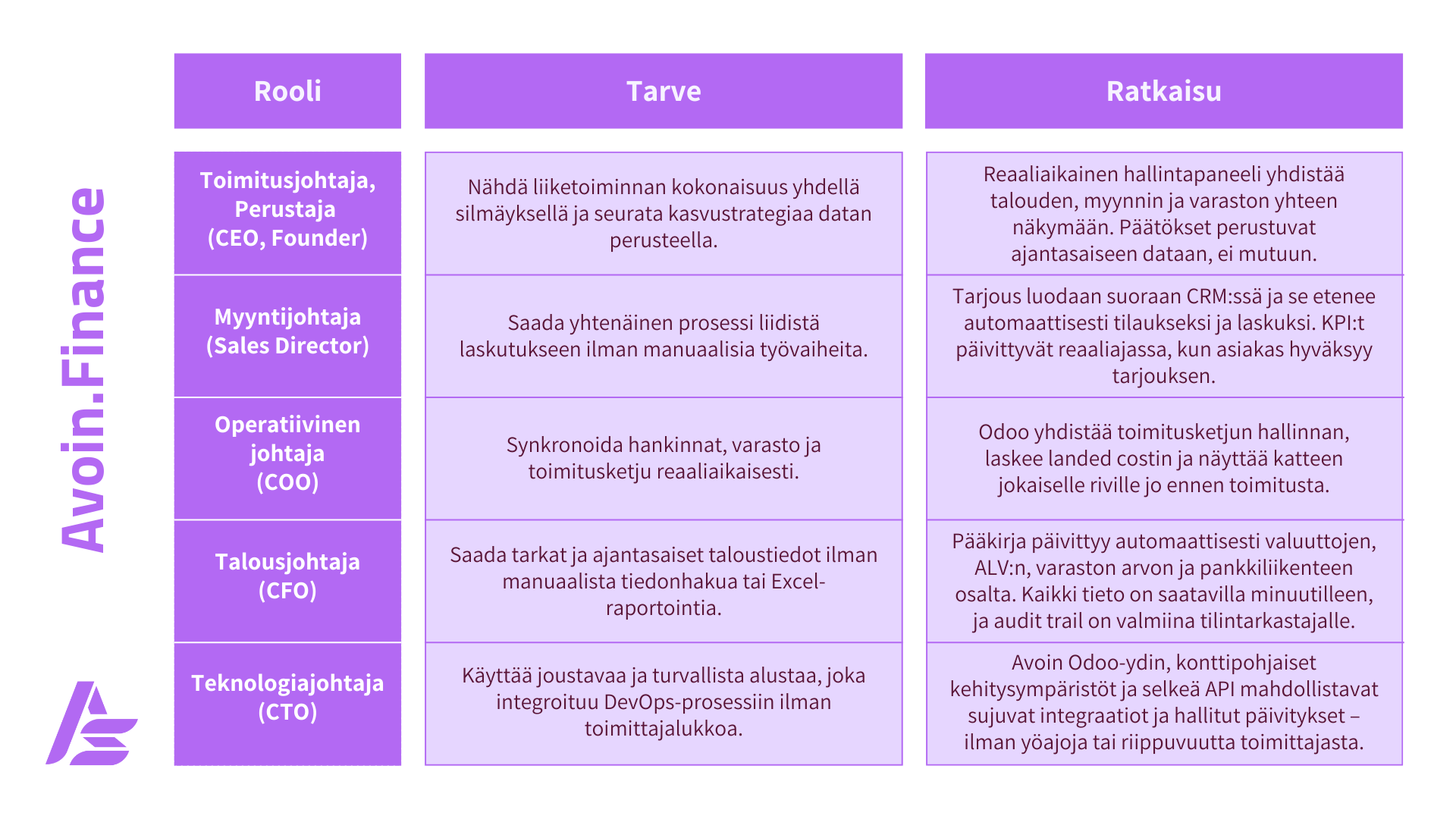 Odoo on laajasti käytetty avoimen lähdekoodin ERP-järjestelmä, joka tunnetaan modulaarisuudestaan ja skaalautuvuudestaan. Avoin.Finance eli laajennettu Odoon taloushallinto tarjoaa mahdollisuuden hoitaa ERP-järjestelmässä kaikki talouden prosessit, kuten laskutuksen, pankkitilien täsmäytyksen, veroraportoinnin, sekä tarjoaa automatisoidut kirjanpitotoiminnot ja maksatuksen hallinnan. Kun liiketoiminnan ja talouden prosessit ovat yhden järjestelmän sisällä, tarve käyttää useita ohjelmistoja vähenee. Tämä helpottaa tiedonkulkua ja vähentää manuaalista työtä.