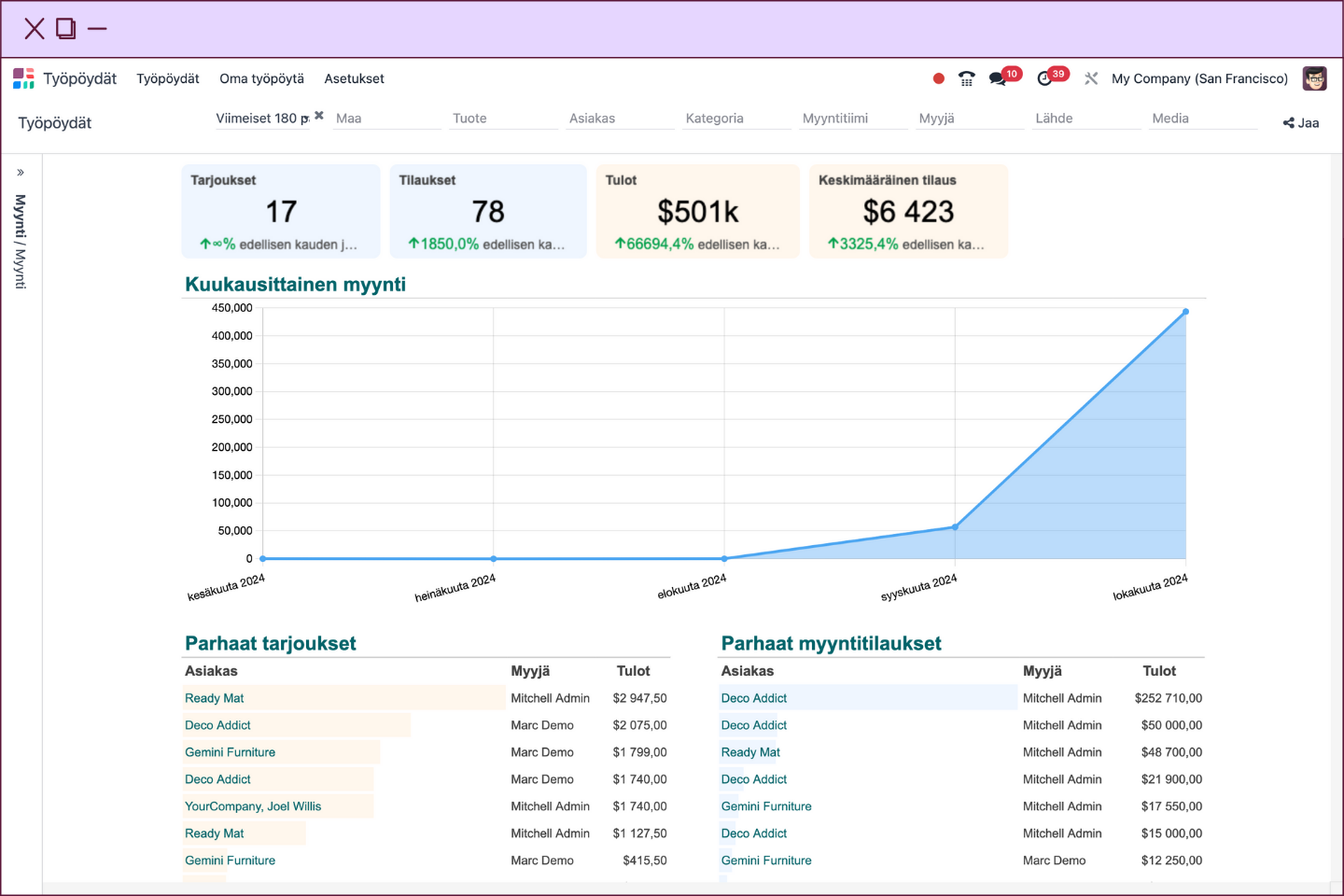 Hyödynnä Odoon dataa oppiaksesi enemmän asiakkaistasi. Selvitä, ketkä ovat yrityksesi parhaita asiakkaita taloudellisesti, keneltä tulee eniten tukipyyntöjä, milloin asiakkaat yleensä ostavat ja mitkä tuotteet tai palvelut kiinnostavat tiettyjä kohderyhmiä. Analysoi myös, mistä kanavista saat eniten liidejä ja asiakkaita, ja toisaalta, mitkä kanavat tuottavat vähiten tuloksia. Näiden tietojen avulla voit tunnistaa, mikä markkinointikanava on kannattavin, sekä mihin asiakkaisiin myyjiltä kuluu eniten aikaa.