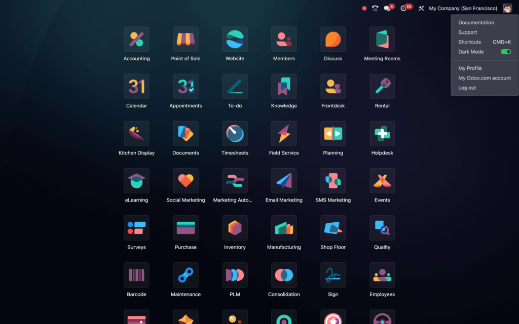 Yksi Odoo 17 odotetuimmista ominaisuuksista on dark mode eli vaihtoehtoinen tumma teema. Valitsemalla dark moden käyttäjät voivat nauttia Odoon käyttökokemuksesta tummalla väriskaalalla.
