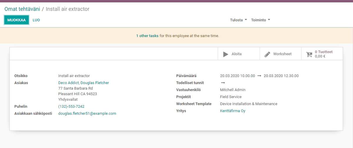 Yksittäisen työmääräyksen luominen on Odoomaisen helppoa ja kätevää. Tuli yhteydenotto tai huoltopyyntö mistä tahansa esim. soitto tai sähköposti, luodaan työmääräys-moduulissa uusi tietue. Asiakkaan osoitetiedot tulevat CRM-kannasta, ja työmääräykselle valitaan sopivat päivämäärät. Kun on valittu vielä vastuutettu henkilö Odoo tarkistaa kuinka monta muuta työmääräystä samalla työntekijällä on samaan aikaan ja ilmoittaa ne. Vaihtoehtoisesti työmääräykselle voidaan lisätä kevyesti muokattavissa oleva työkirja.