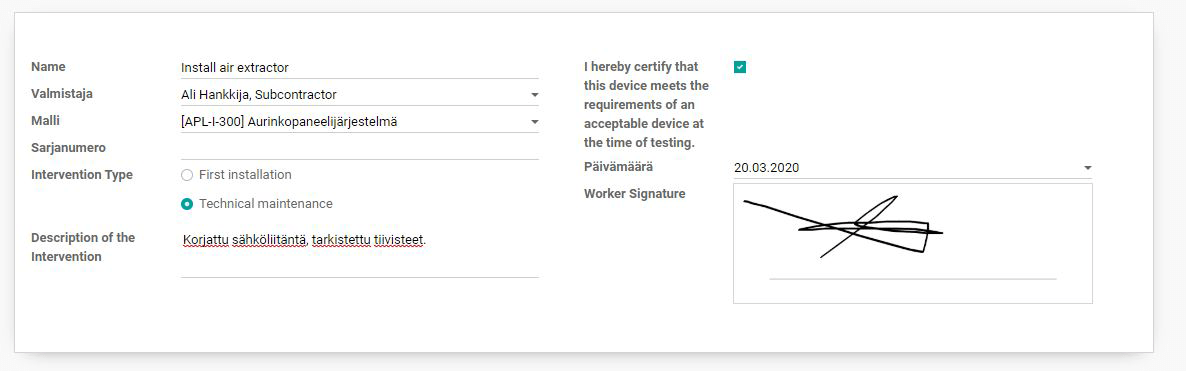 Field service -moduulin tavoittena on saada tieto työmääräystä tekevälle henkilölle mahdollisimman tarkasti: mitä tulee tehdä sekä helpottaa kulutetun ajan ja varaosien määrän hallintaa. Samalla mahdollistetaan allekirjoitetut todistukset huollosta sekä laskujen luominen. Kokonaisuudessaan Odoon kautta pyöritetään siis esimerkiksi vesiboilerin huolto kustannuksineen kaikkineen.