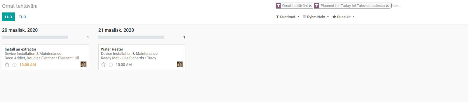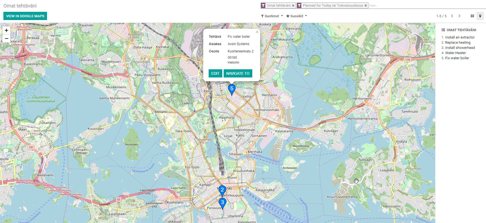 Odoon käyttäjille työmääräyksien näkymä on tuttu, sillä se muistuttaa pitkälti projektien näkymää. Vaiheiden sijaan työmääräykset jaetaan päivämäärän mukaan kanban-näkymään. Uutuutena työmääräysten kanssa on tuotu samaan aikaan täysin uusi karttanäkymä, joka Google Mapsin kanssa sijoittaa asiakkaat kartalle, ja pystyy luomaan optimaalisen reitin niiden välille!