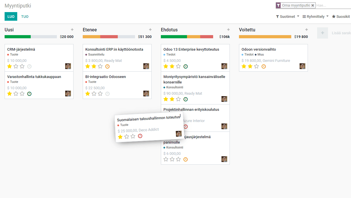 Myyjät ovat usein tyytyväisiä, kun myyntimahdollisuuden edetessä voi sitä helposti siirtää järjestelmässä myyntisyklin mukaisesti eteenpäin. Odoossa hienoa on se, että jokainen yritys voi itse päättää minkälainen on heille sopivin myyntivaiheistus liidin etenemisestä kaupaksi.