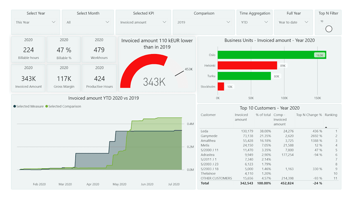 Raporttien näkyvyyttä eri kohderyhmille pystyy myös rajaamaan työkalussa vaivattomasti eri käyttäjäoikeuksia muokkaamalla. Visuaaliset raportit mahdollistavat tunnuslukujen taakse kätkeytyvien transaktioiden tarkastelun tarkasti. Näin pystyt seuraamaan yksityiskohtaisesti esimerkiksi projektien kannattavuutta ja porautumaan verkkokaupan kampanjoiden kannattavuuteen.