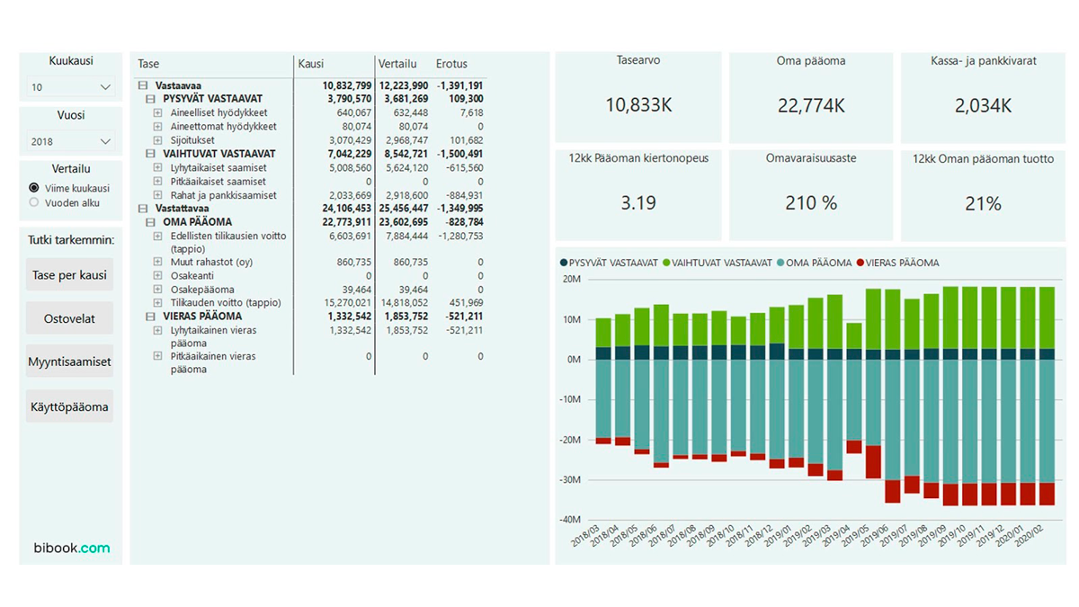 Esimerkki kirjanpitojärjestelmän datasta tehdystä raportista BI Bookissa: