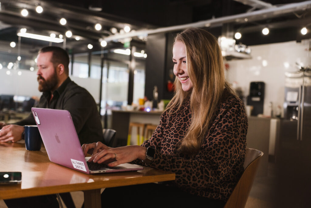 Tiimiläisiä toimistolla sohvalla ja pöydän ääressä