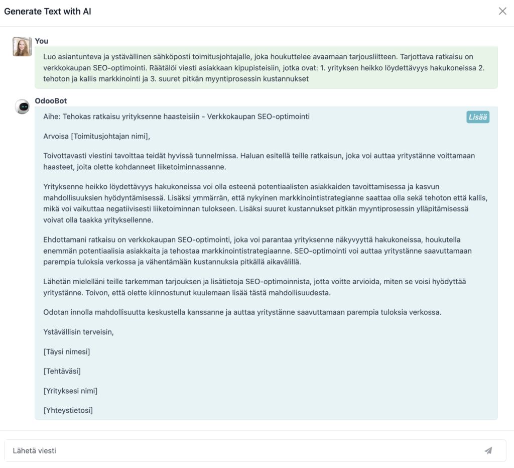 Luo automaattisesti personoituja myyntiviestejä asiakkaille OdooBotin avulla. Saat viestistä tehokkaamman räätälöimällä viestin kohderyhmän tarpeeseen eli tarkentamalla kehotetta (prompt).