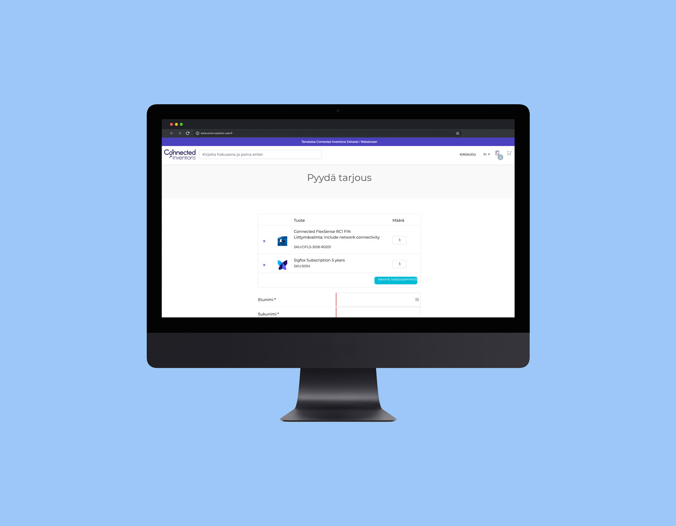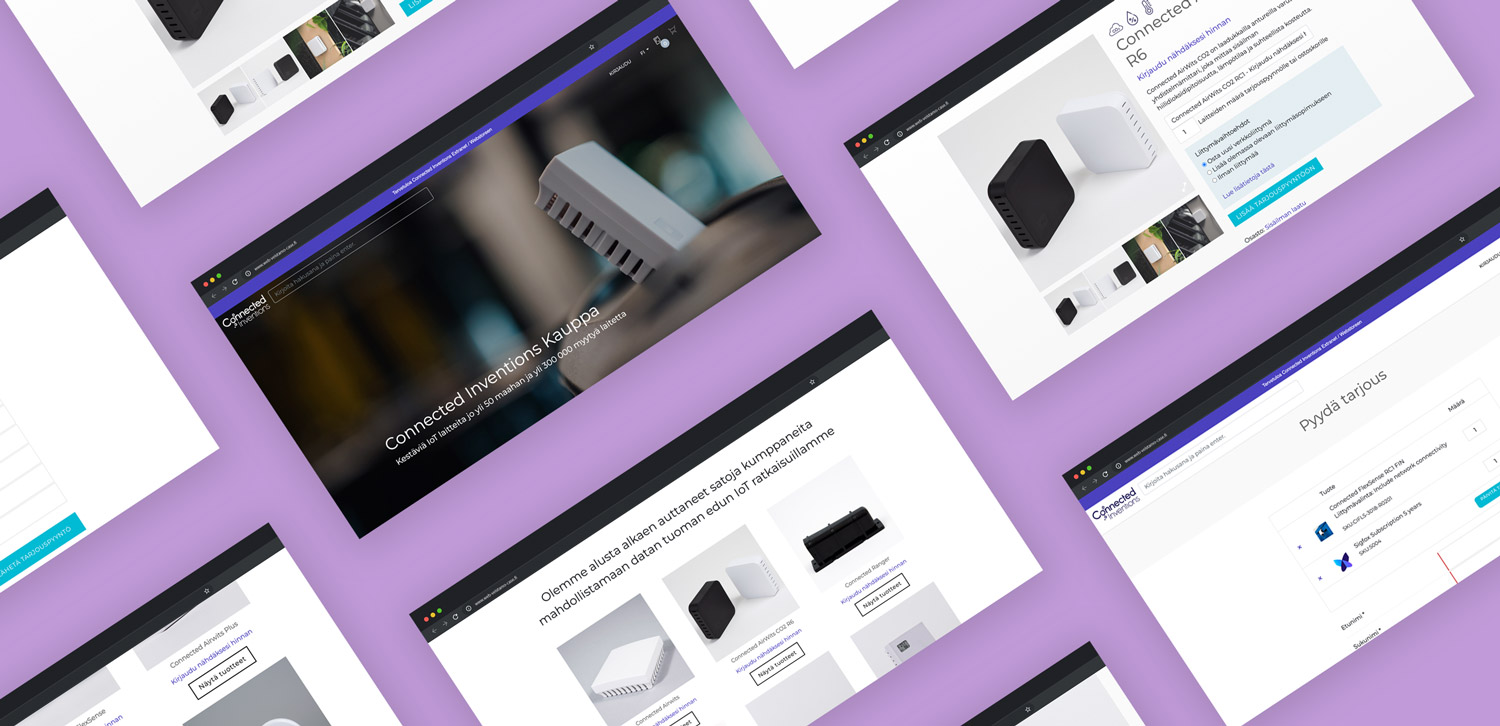 Projektin tavoitteena oli tuottaa yrityksen brändin mukainen Connected Inventions B2B-verkkokauppa, ja integroida se toteuttamaamme Odoo ERP-järjestelmään. Connectedilla oli ennestään markkinointisivut yrityksensä palveluille ja tuotteille, mutta sivuilta puuttuivat hinnat ja tilausmahdollisuudet, eli käytännössä kaikki verkkokauppatoiminnallisuudet.