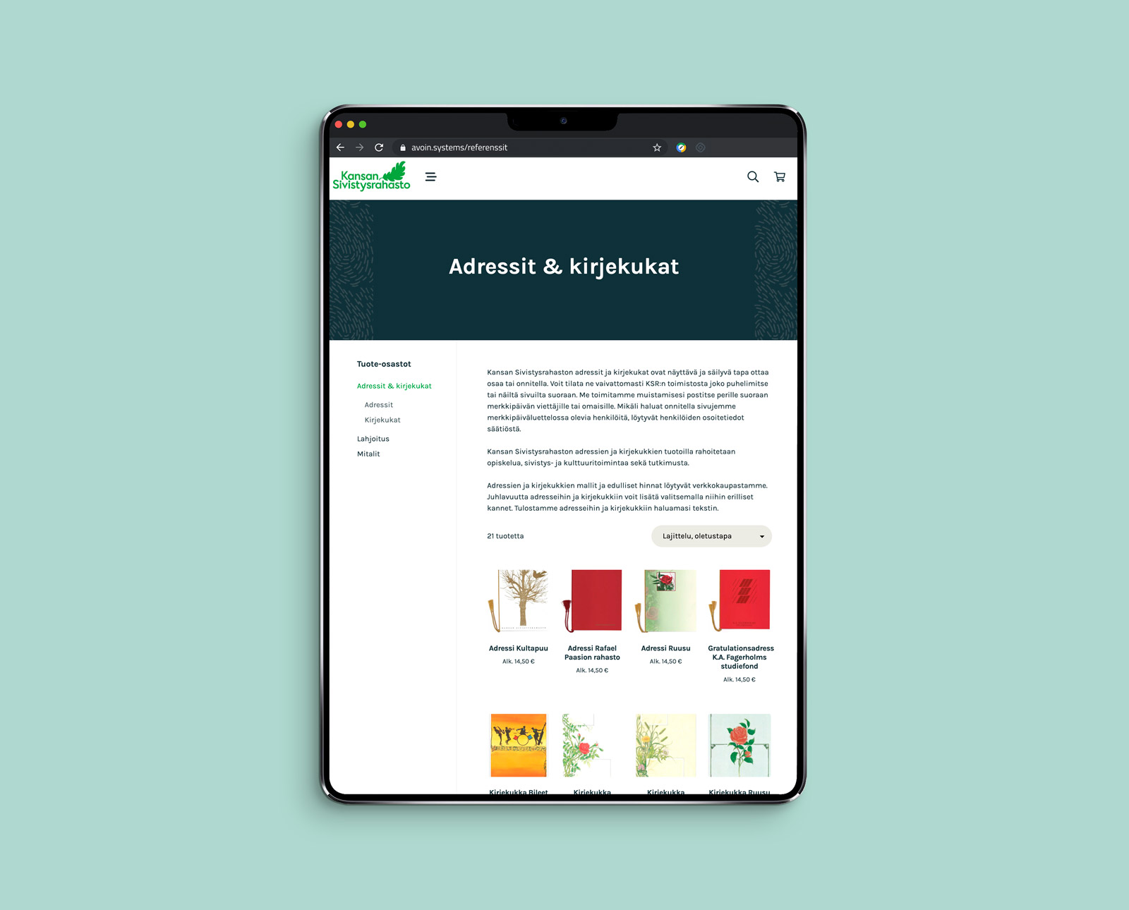 Verkkokaupan tuotteita räätälöitiin Kansan Sivistysrahaston ostopolkua tukevaksi ja mahdollistettiin se, että samassa ostossa käyttäjä voi tilata sekä fyysisiä tuotteita että tehdä lahjoituksen, joka ei aiemmassa ratkaisussa ollut mahdollista. Fyysisiin tuotteisiin (esim. adressit) tehtiin lisäkenttiä, niin että käyttäjä voi lisätä niihin oston yhteydessä haluamansa tekstin ja syöttää tilauksen yhteydessä myös suoraan saajan osoitteen. Verkkokauppaan lisättiin myös toiminnallisuus, jossa käyttäjät voivat luoda haluamalleen henkilölle merkkipäiväkeräyksen, jolloin verkkokaupasta voidaan helposti lahjoittaa suoraan ko. merkkipäiväkeräykseen.
