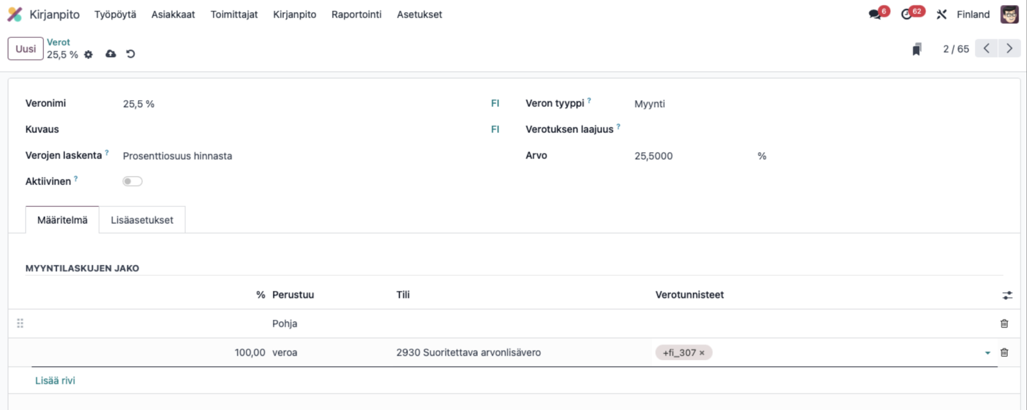 Ethän päivitä nykyistä 24 prosentin veronimikettä järjestelmässä suoraan 25,5 prosenttiin, jotta historialliset tiedot eivät päivity takautuvasti virheelliselle veronimikkeelle. Oikea tapa on luoda uusi veronimike. Samaa koskee muita mahdollisia veronimikkeitä, kuten yhteisökauppaa.