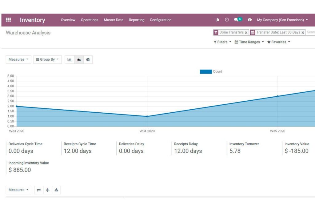 Odoon kaksinkertaisella varastokirjanpidolla voidaan varmistua tavaroiden kulusta, ja esimerkiksi sarja- tai eränumeroiden seurannassa voidaan hyödyntää aukotonta seurantaa. Ostot puolestaan voidaan automatisoida perustuen hälytysrajoihin tai muihin sääntöihin.