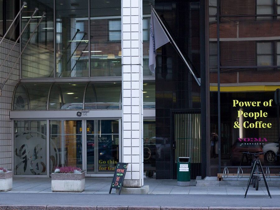 Näet talon valkoisen julkisivun Kuortaneenkadun puolella. Sisäänkäynti pääovesta, jonka yläpuolella lukee Vallila Corner. Astu rohkeasti sisään!